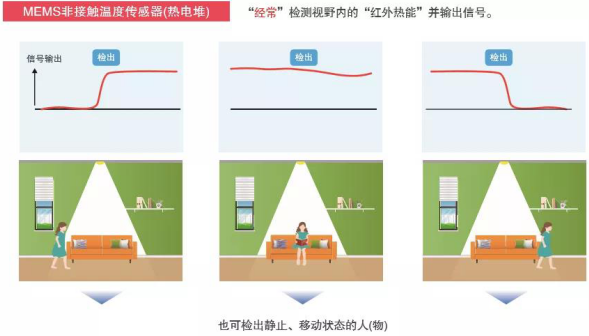 MEMS非接觸式溫度傳感器D6T系列通過檢測人和周邊環(huán)境之間的溫度差和溫度變化,可檢測到人體。其可根據(jù)細微的溫度差和溫度變化進行檢測,適用于家電節(jié)能、安防設備等各種用途,廣泛應用于HEMS、BEMS領域。