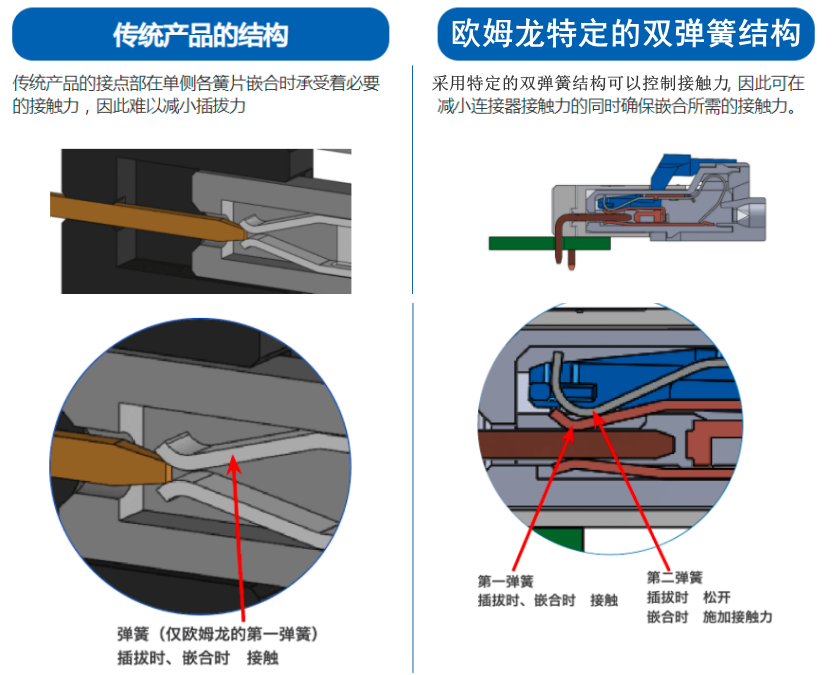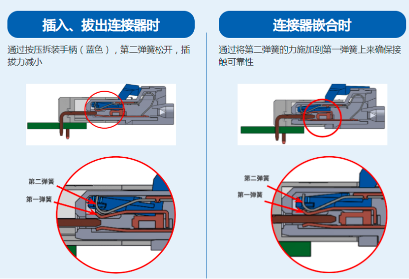 特征1其特點(diǎn)雙彈簧結(jié)構(gòu):在嵌合時(shí)通過第一彈簧和第二彈簧的接觸合力確保接觸可靠性,并在插拔時(shí)通過操作手柄打開第二彈簧來減小插拔力。如下圖