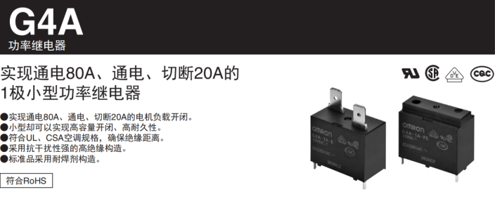 歐姆龍G4A系列繼電器,實(shí)現(xiàn)通電80A、通電、切斷20A的電機(jī)負(fù)載開閉,1極小型功率繼電器,卻可以實(shí)現(xiàn)高容量開閉、高耐久性。符合RoHS、EN/IEC(VDE認(rèn)證)、UL、CSA空調(diào)規(guī)格,確保絕緣距離,采用抗干擾性強(qiáng)的高絕緣構(gòu)造。標(biāo)準(zhǔn)品采用耐助焊劑構(gòu)造。