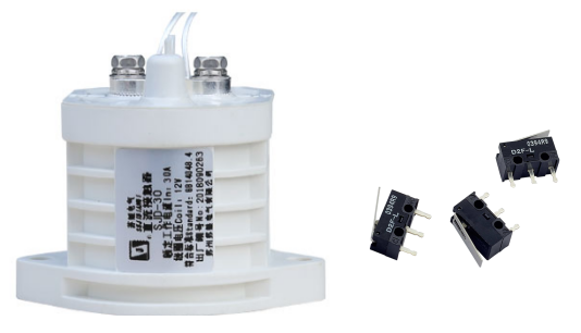 直流接觸器為了檢測主觸點的通斷情況,通常還設有一組輔助觸點,該組輔助觸點通常采用微動開關來實現(xiàn),也就是說,現(xiàn)有技術的這種直流接觸器設有一個微動開關,用來檢測主觸點的通斷情況,實現(xiàn)該設計方案時,是在推動桿上裝有一撥動臂,在直流接觸器內(nèi)的對應位置裝上述微動開關,當推動桿帶動動簧運動使主動觸點和主靜觸點接觸時,推動桿同時帶動撥動臂運動,通過撥動臂觸動微動開關的動臂,使微動開關接通或斷開,通過直流接觸器的電路板對微動開關接通或斷開信號的檢測,從而實現(xiàn)對主觸點通斷情況的檢測。