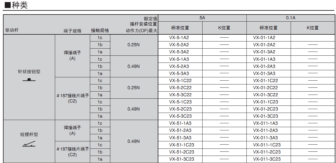 ? 從微小負(fù)載到5A型品種豐富多樣,和V系列小型基本 開(kāi)關(guān)形狀相同。